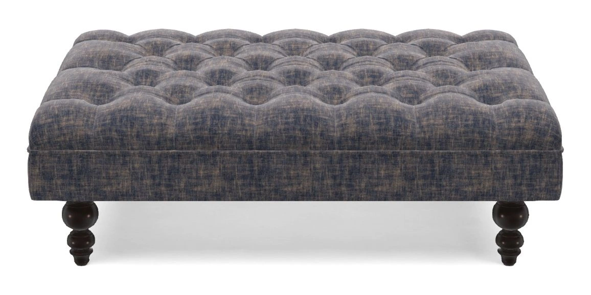 A traditionally styled, large, low rectangular footstool featuring classic buttoning and solid hardwood turned feet.