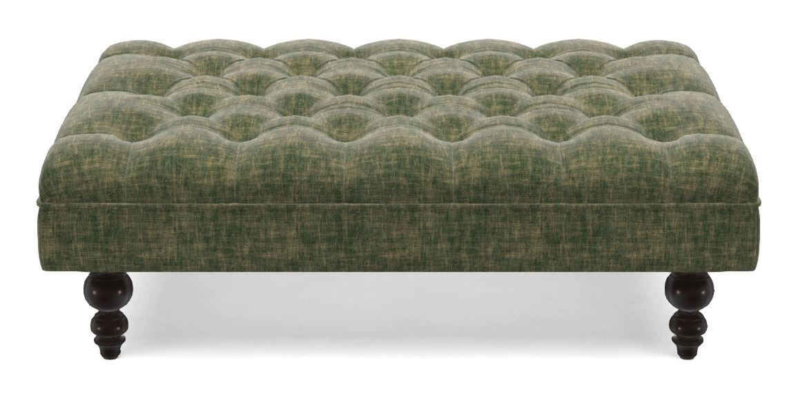 A traditionally styled, large, low rectangular footstool featuring classic buttoning and solid hardwood turned feet.
