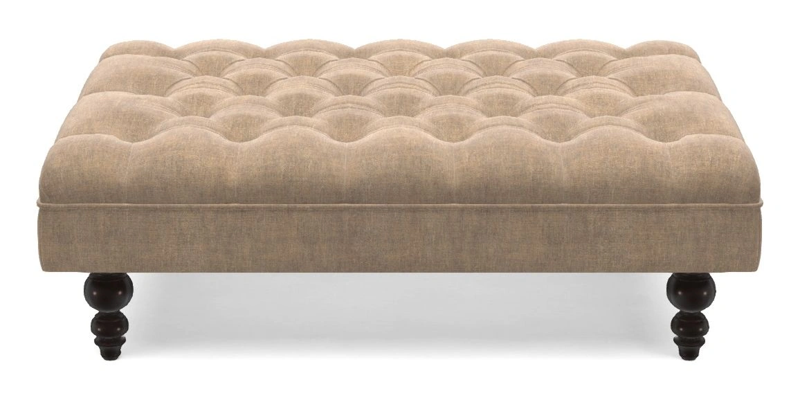 A traditionally styled, large, low rectangular footstool featuring classic buttoning and solid hardwood turned feet.
