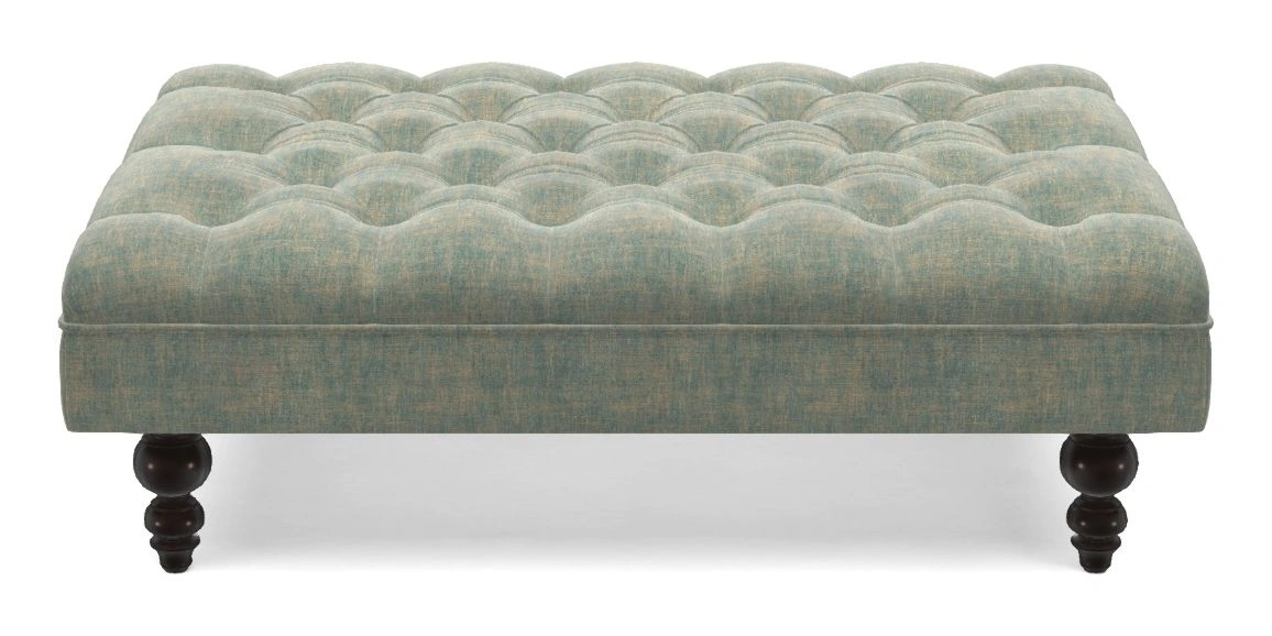 A traditionally styled, large, low rectangular footstool featuring classic buttoning and solid hardwood turned feet.