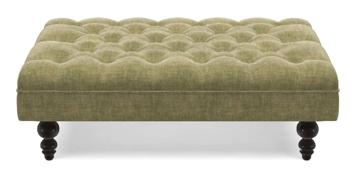 A traditionally styled, large, low rectangular footstool featuring classic buttoning and solid hardwood turned feet.
