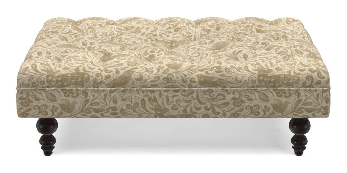 A traditionally styled, large, low rectangular footstool featuring classic buttoning and solid hardwood turned feet.