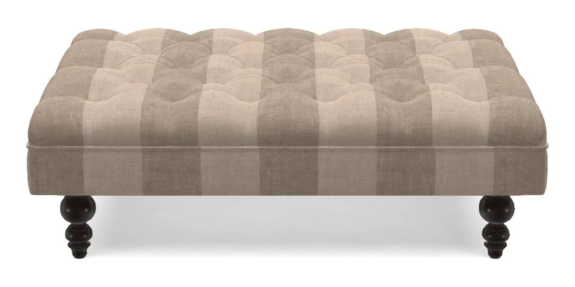 A traditionally styled, large, low rectangular footstool featuring classic buttoning and solid hardwood turned feet.