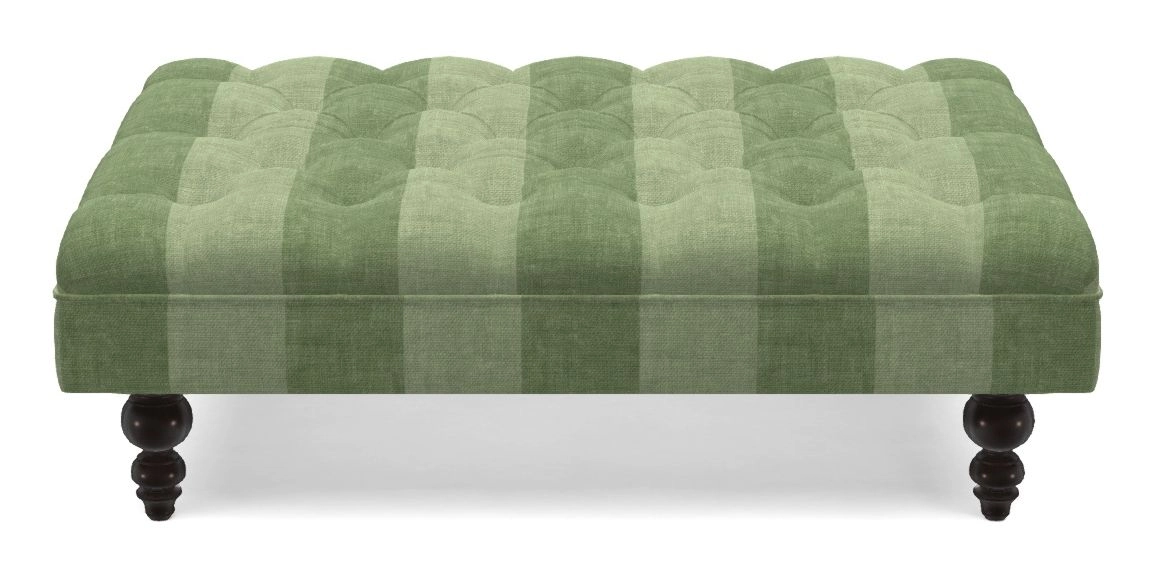 A traditionally styled, large, low rectangular footstool featuring classic buttoning and solid hardwood turned feet.