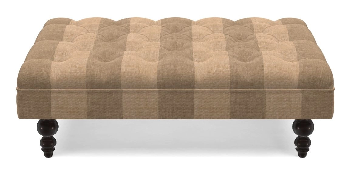 A traditionally styled, large, low rectangular footstool featuring classic buttoning and solid hardwood turned feet.