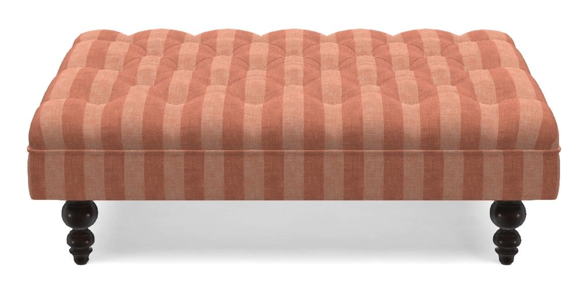 A traditionally styled, large, low rectangular footstool featuring classic buttoning and solid hardwood turned feet.