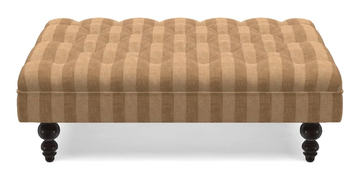 A traditionally styled, large, low rectangular footstool featuring classic buttoning and solid hardwood turned feet.