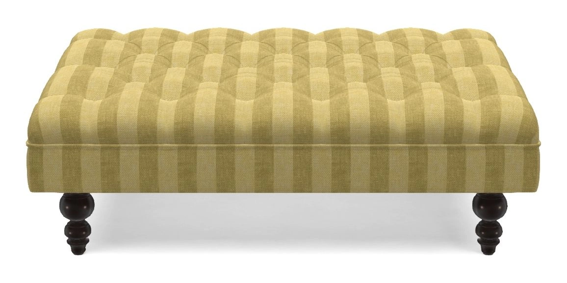 A traditionally styled, large, low rectangular footstool featuring classic buttoning and solid hardwood turned feet.