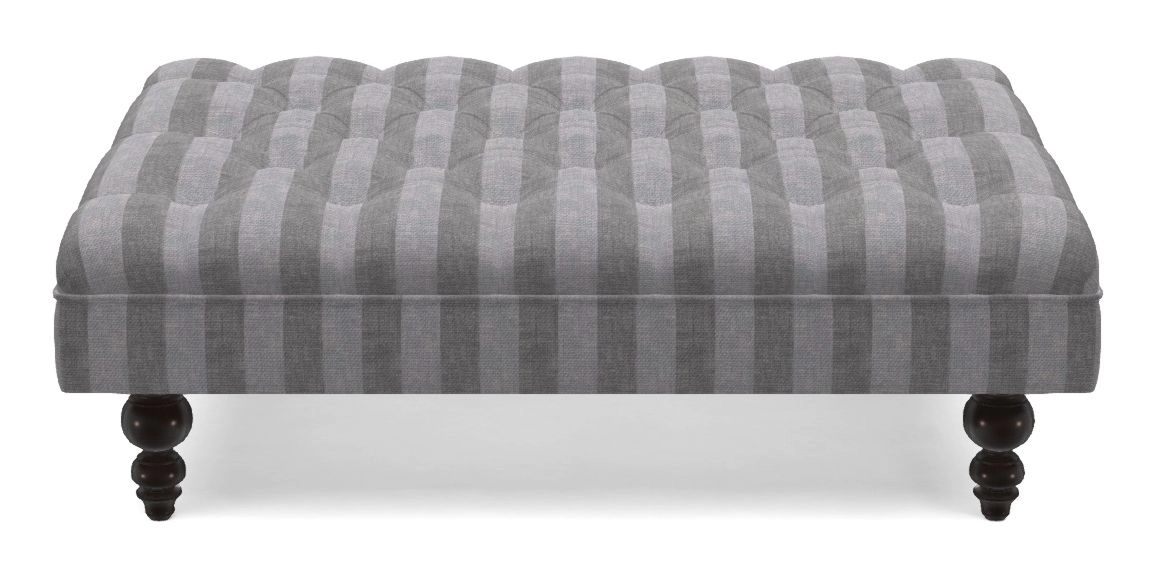 A traditionally styled, large, low rectangular footstool featuring classic buttoning and solid hardwood turned feet.