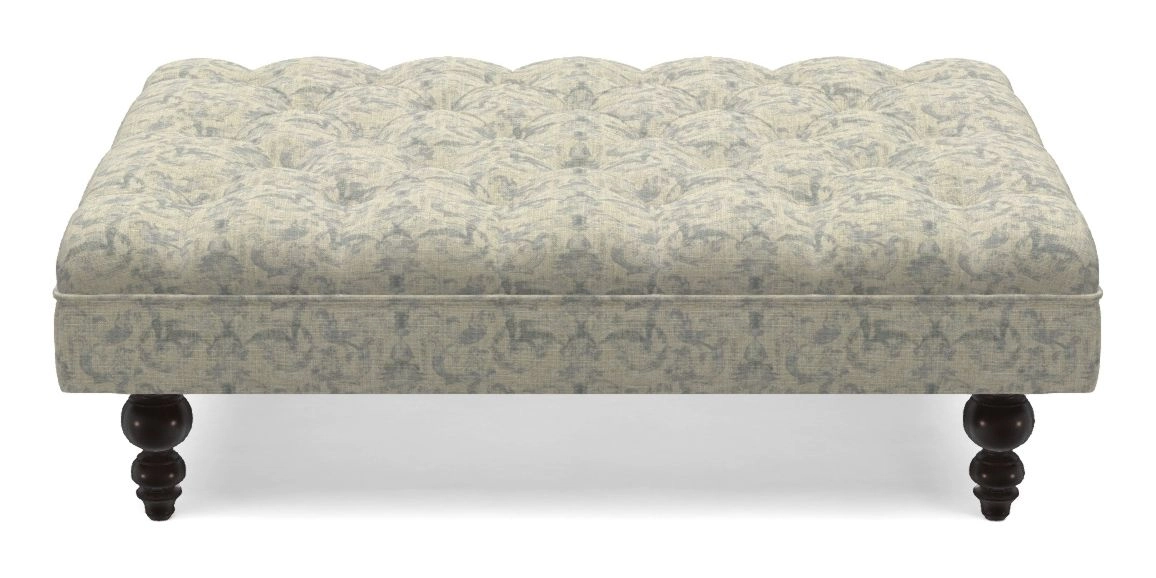 A traditionally styled, large, low rectangular footstool featuring classic buttoning and solid hardwood turned feet.