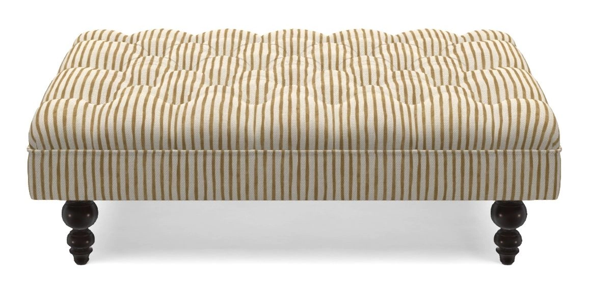 A traditionally styled, large, low rectangular footstool featuring classic buttoning and solid hardwood turned feet.