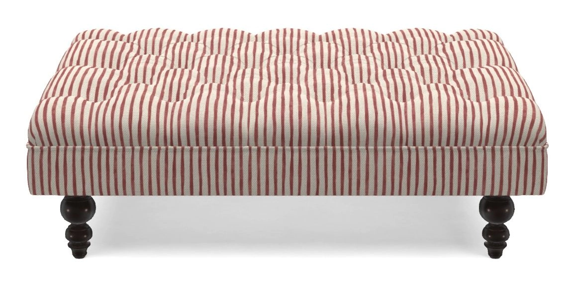 A traditionally styled, large, low rectangular footstool featuring classic buttoning and solid hardwood turned feet.