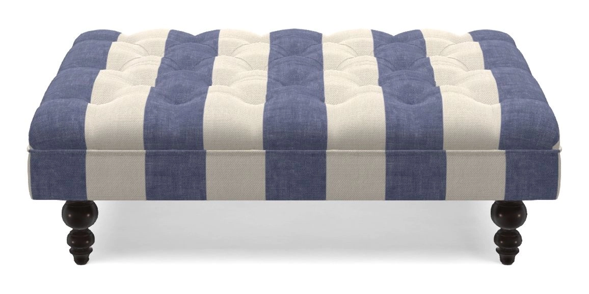 A traditionally styled, large, low rectangular footstool featuring classic buttoning and solid hardwood turned feet.