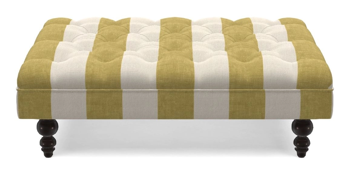 A traditionally styled, large, low rectangular footstool featuring classic buttoning and solid hardwood turned feet.