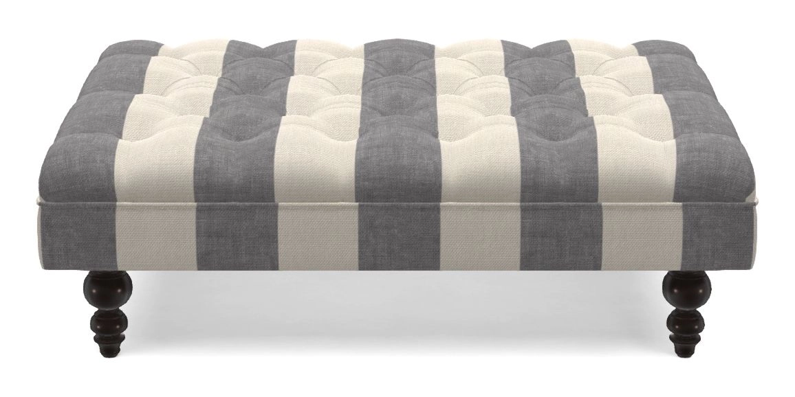 A traditionally styled, large, low rectangular footstool featuring classic buttoning and solid hardwood turned feet.