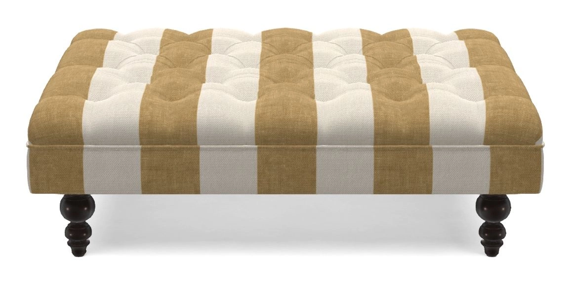 A traditionally styled, large, low rectangular footstool featuring classic buttoning and solid hardwood turned feet.