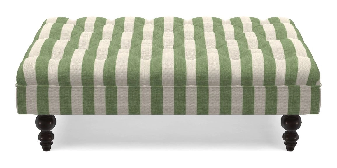 A traditionally styled, large, low rectangular footstool featuring classic buttoning and solid hardwood turned feet.