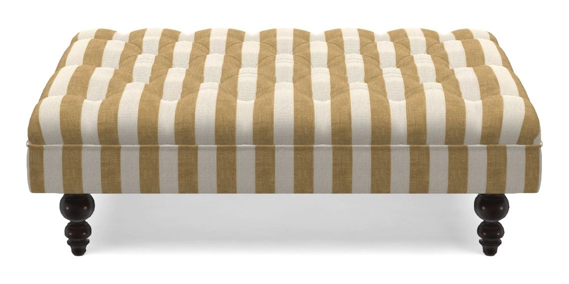 A traditionally styled, large, low rectangular footstool featuring classic buttoning and solid hardwood turned feet.