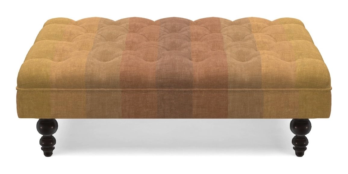 A traditionally styled, large, low rectangular footstool featuring classic buttoning and solid hardwood turned feet.