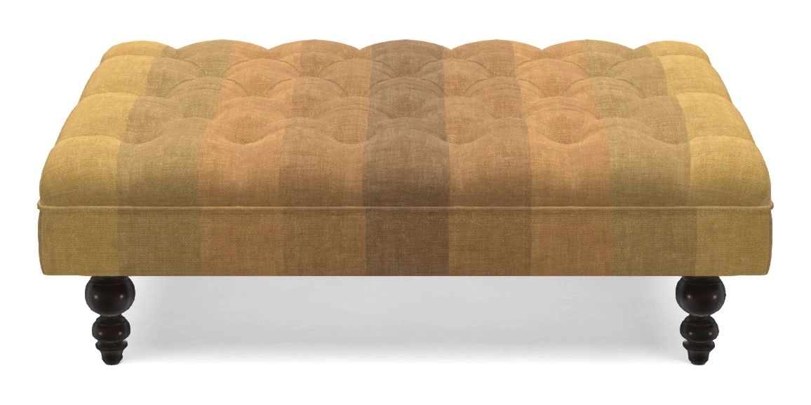 A traditionally styled, large, low rectangular footstool featuring classic buttoning and solid hardwood turned feet.