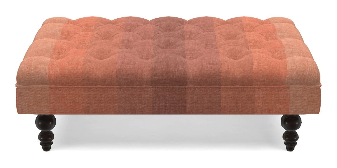 A traditionally styled, large, low rectangular footstool featuring classic buttoning and solid hardwood turned feet.