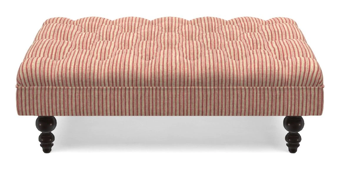 A traditionally styled, large, low rectangular footstool featuring classic buttoning and solid hardwood turned feet.