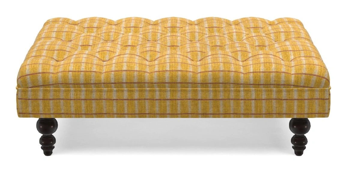 A traditionally styled, large, low rectangular footstool featuring classic buttoning and solid hardwood turned feet.