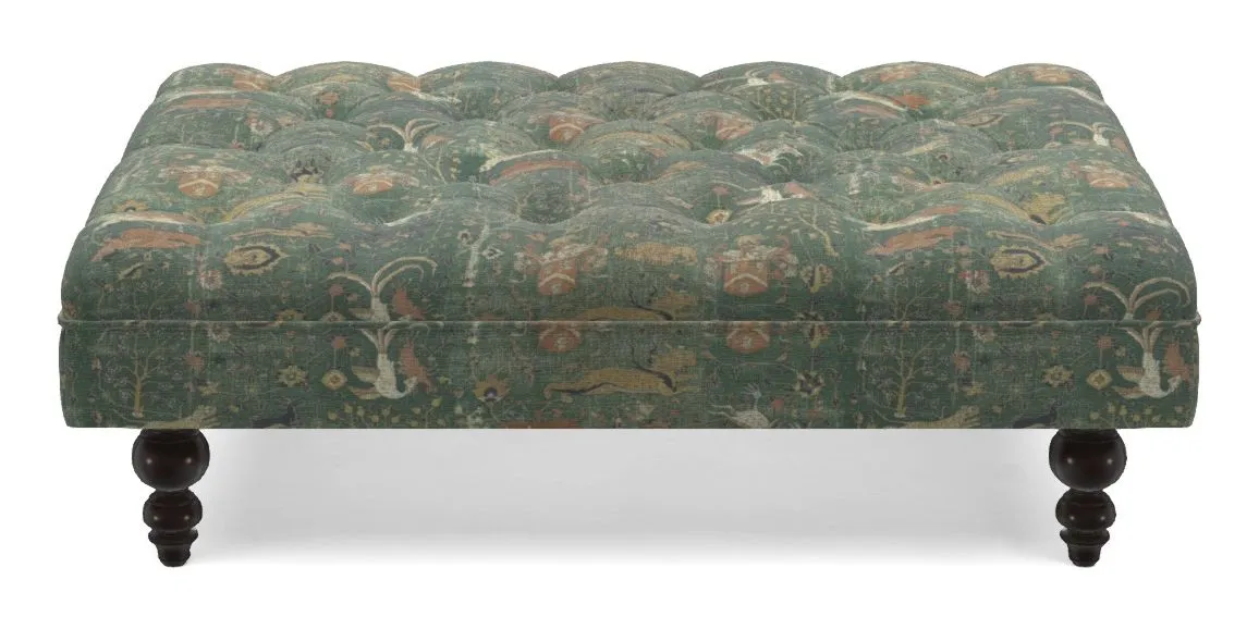 A traditionally styled, large, low rectangular footstool featuring classic buttoning and solid hardwood turned feet.