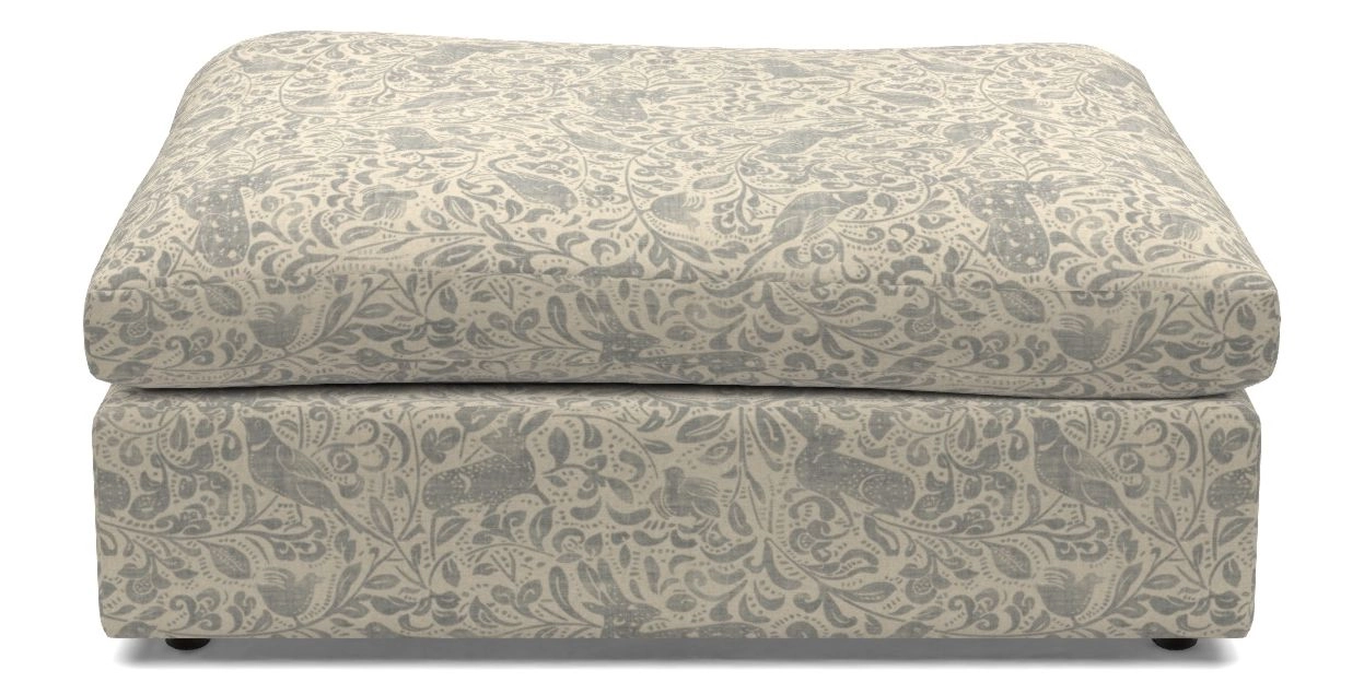 A large, cushioned box-shaped stool on dark-stained solid wood glide feet. Comfortable as a footrest and ideal for holding books, magazines, or a tray of tea and treats. View other products in this range.
