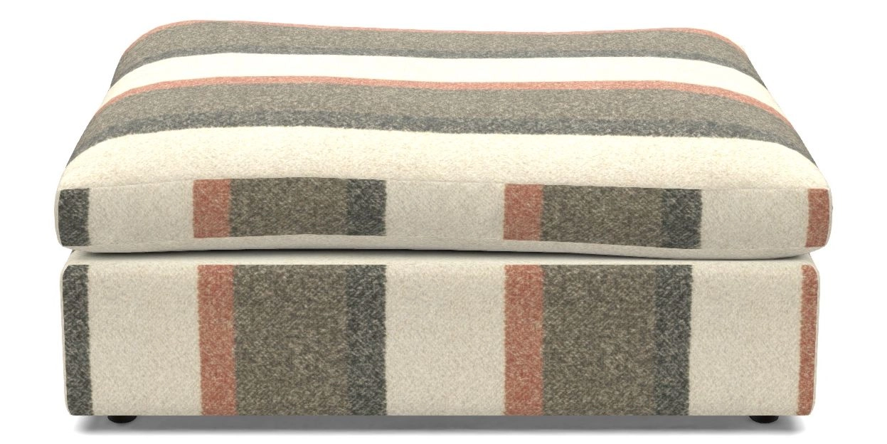 A large, cushioned box-shaped stool on dark-stained solid wood glide feet. Comfortable as a footrest and ideal for holding books, magazines, or a tray of tea and treats. View other products in this range.