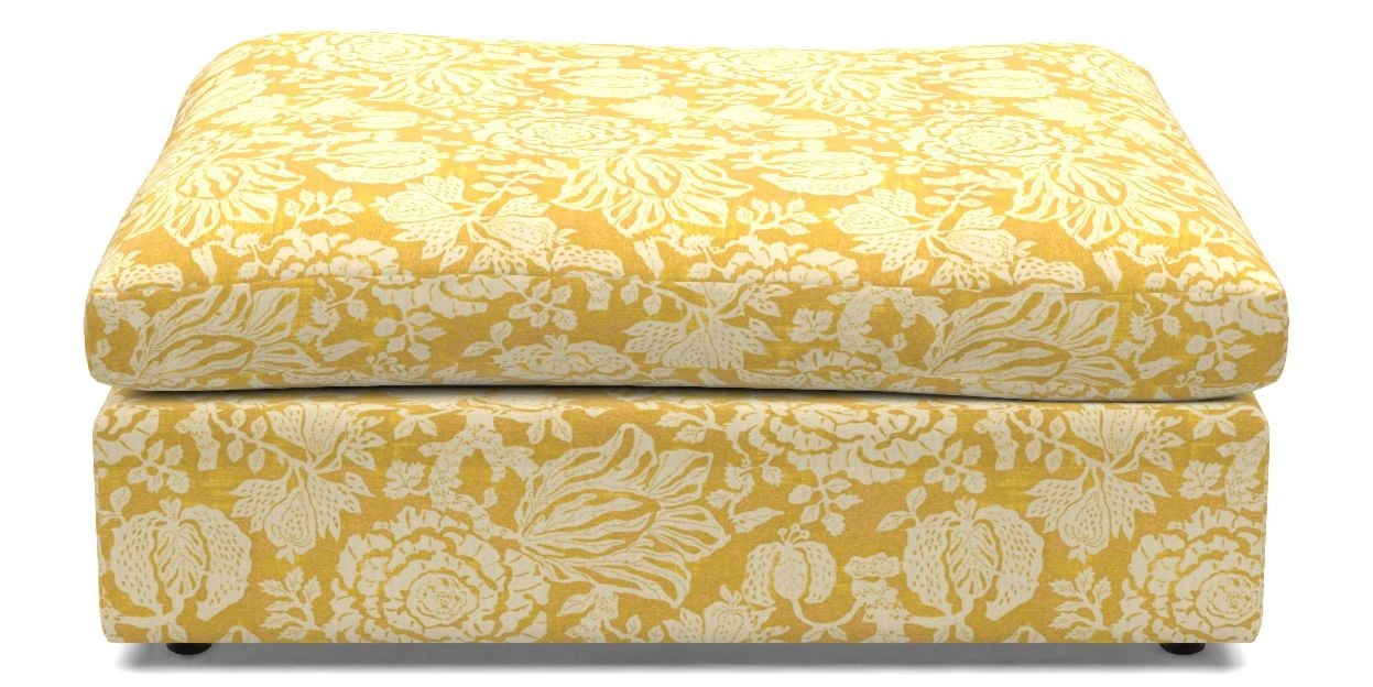 A large, cushioned box-shaped stool on dark-stained solid wood glide feet. Comfortable as a footrest and ideal for holding books, magazines, or a tray of tea and treats. View other products in this range.