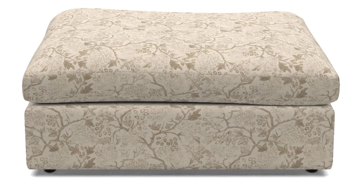 A large, cushioned box-shaped stool on dark-stained solid wood glide feet. Comfortable as a footrest and ideal for holding books, magazines, or a tray of tea and treats. View other products in this range.