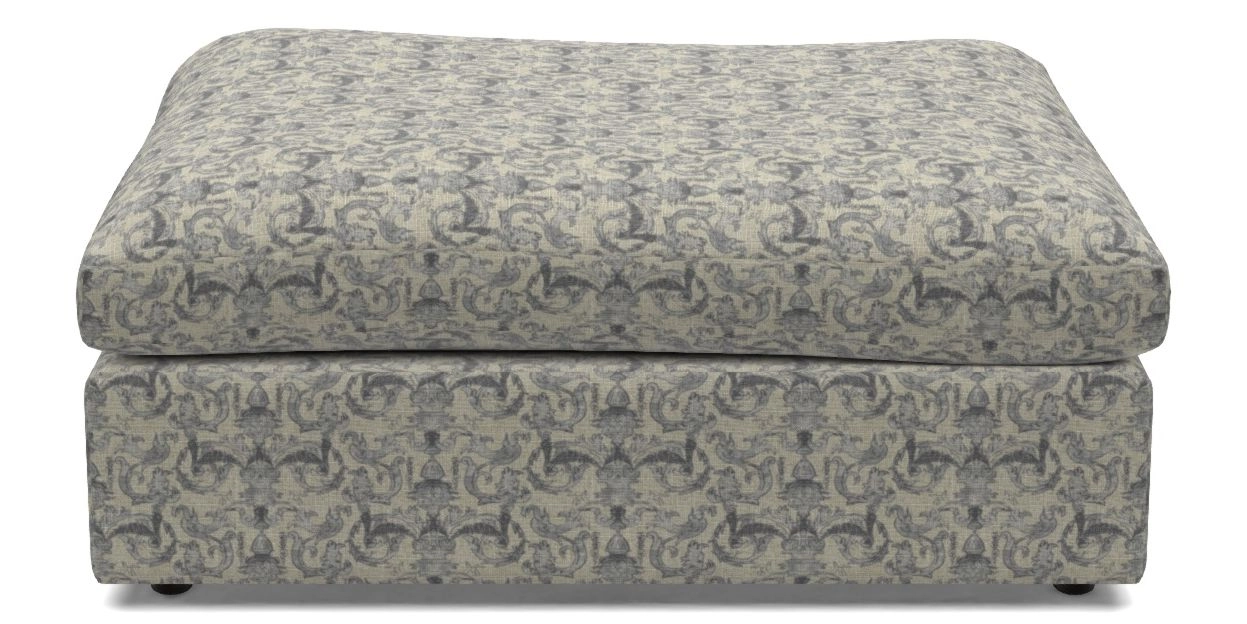 A large, cushioned box-shaped stool on dark-stained solid wood glide feet. Comfortable as a footrest and ideal for holding books, magazines, or a tray of tea and treats. View other products in this range.
