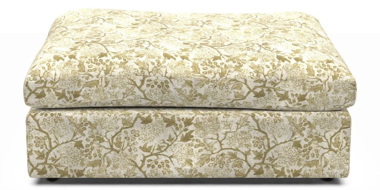 A large, cushioned box-shaped stool on dark-stained solid wood glide feet. Comfortable as a footrest and ideal for holding books, magazines, or a tray of tea and treats. View other products in this range.