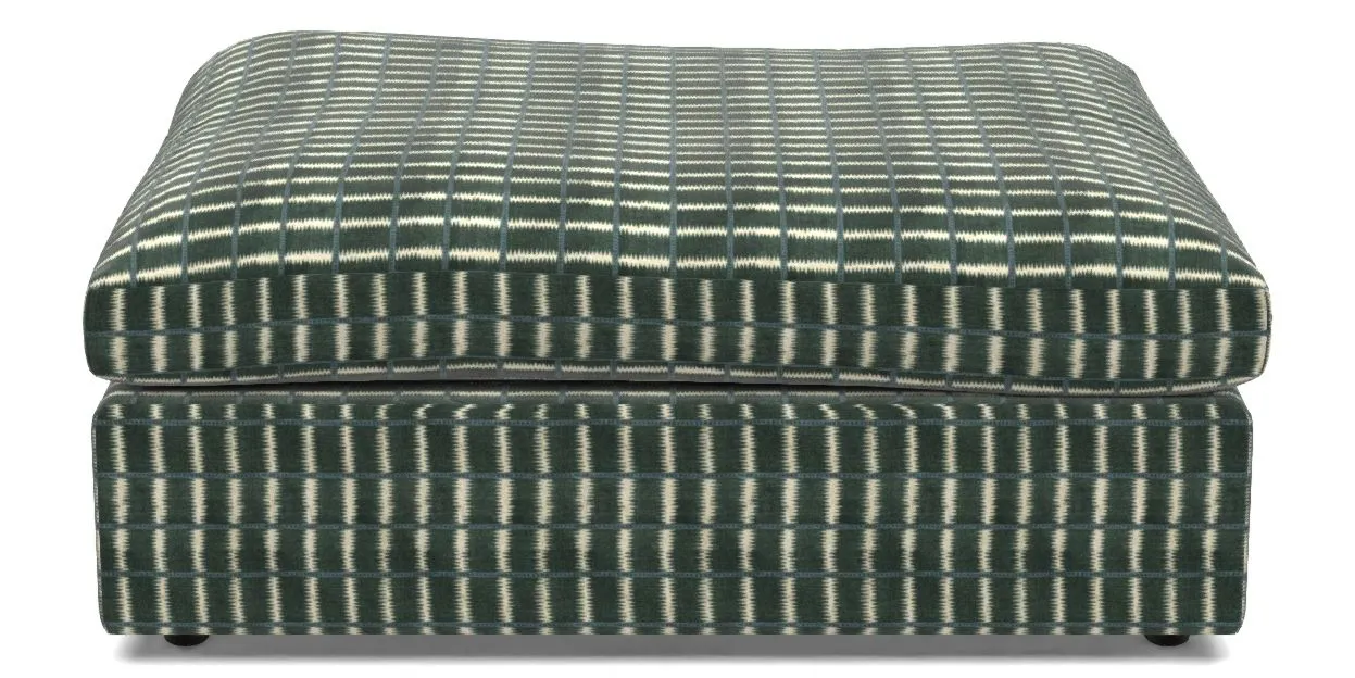 A large, cushioned box-shaped stool on dark-stained solid wood glide feet. Comfortable as a footrest and ideal for holding books, magazines, or a tray of tea and treats. View other products in this range.