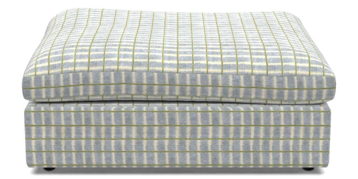 A large, cushioned box-shaped stool on dark-stained solid wood glide feet. Comfortable as a footrest and ideal for holding books, magazines, or a tray of tea and treats. View other products in this range.
