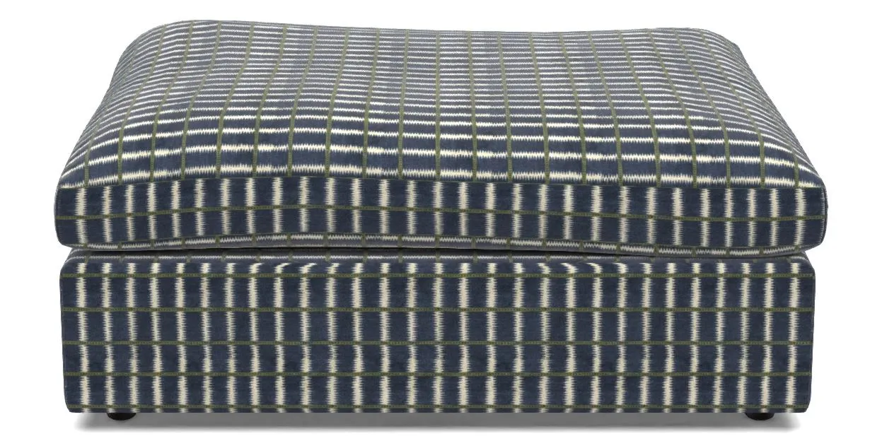 A large, cushioned box-shaped stool on dark-stained solid wood glide feet. Comfortable as a footrest and ideal for holding books, magazines, or a tray of tea and treats. View other products in this range.