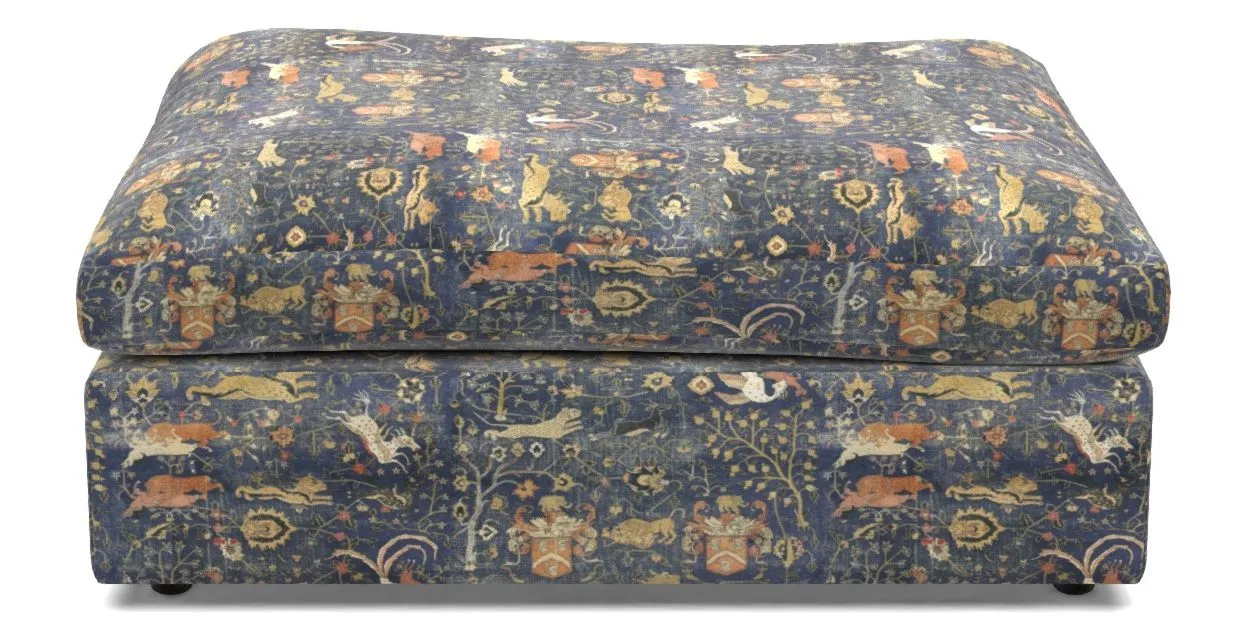 A large, cushioned box-shaped stool on dark-stained solid wood glide feet. Comfortable as a footrest and ideal for holding books, magazines, or a tray of tea and treats. View other products in this range.
