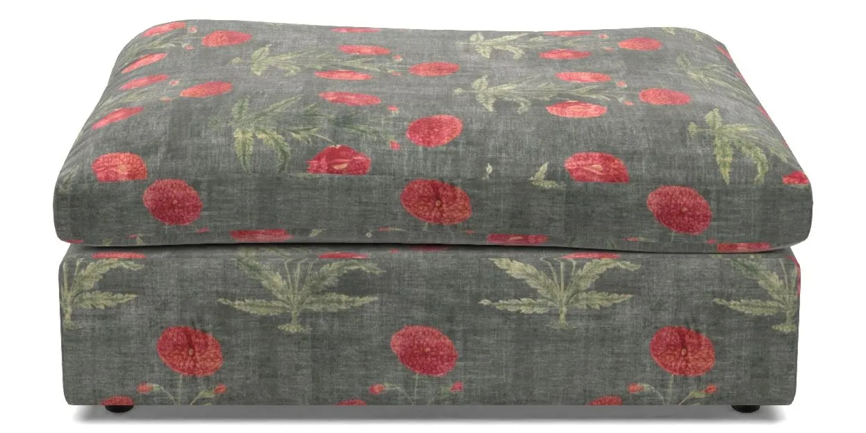 A large, cushioned box-shaped stool on dark-stained solid wood glide feet. Comfortable as a footrest and ideal for holding books, magazines, or a tray of tea and treats. View other products in this range.
