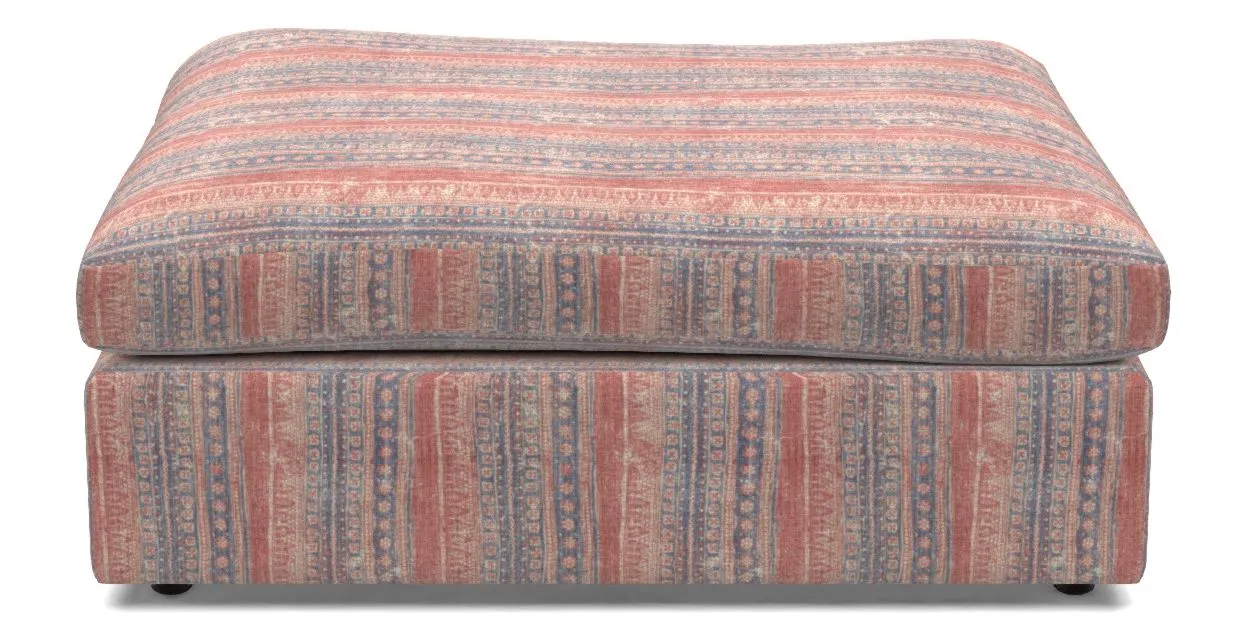 A large, cushioned box-shaped stool on dark-stained solid wood glide feet. Comfortable as a footrest and ideal for holding books, magazines, or a tray of tea and treats. View other products in this range.