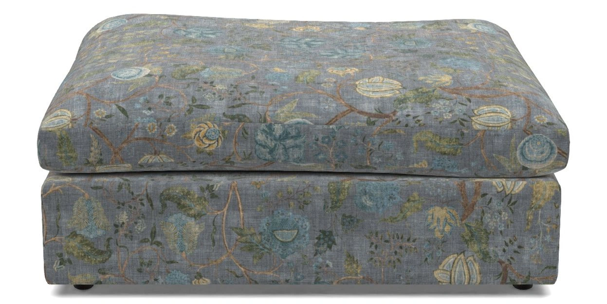 A large, cushioned box-shaped stool on dark-stained solid wood glide feet. Comfortable as a footrest and ideal for holding books, magazines, or a tray of tea and treats. View other products in this range.
