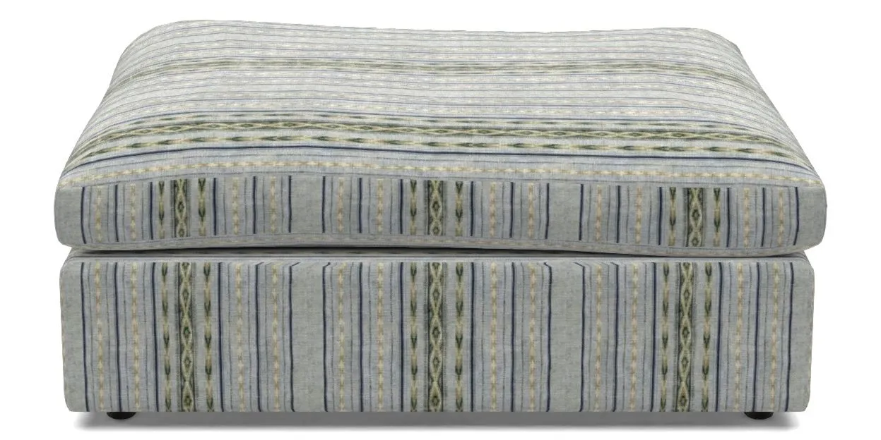 A large, cushioned box-shaped stool on dark-stained solid wood glide feet. Comfortable as a footrest and ideal for holding books, magazines, or a tray of tea and treats. View other products in this range.