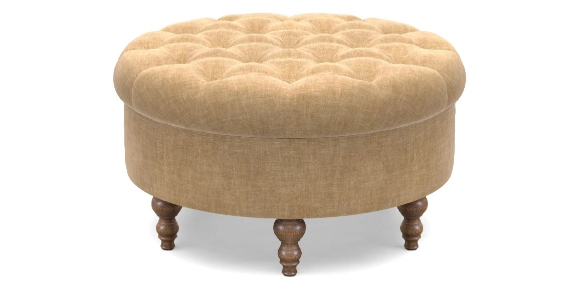 A round, deep-buttoned footstool design that provides a comfortable spot for resting feet or serving a tray of tea. A stylish and practical addition to any space.