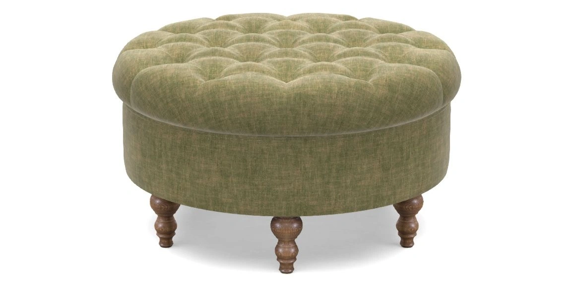 A round, deep-buttoned footstool design that provides a comfortable spot for resting feet or serving a tray of tea. A stylish and practical addition to any space.