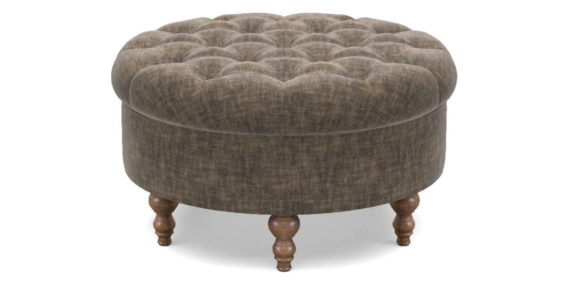 A round, deep-buttoned footstool design that provides a comfortable spot for resting feet or serving a tray of tea. A stylish and practical addition to any space.