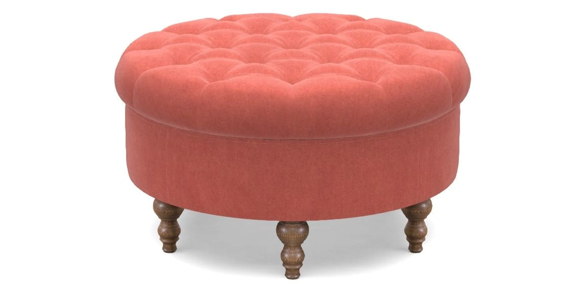 A round, deep-buttoned footstool design that provides a comfortable spot for resting feet or serving a tray of tea. A stylish and practical addition to any space.