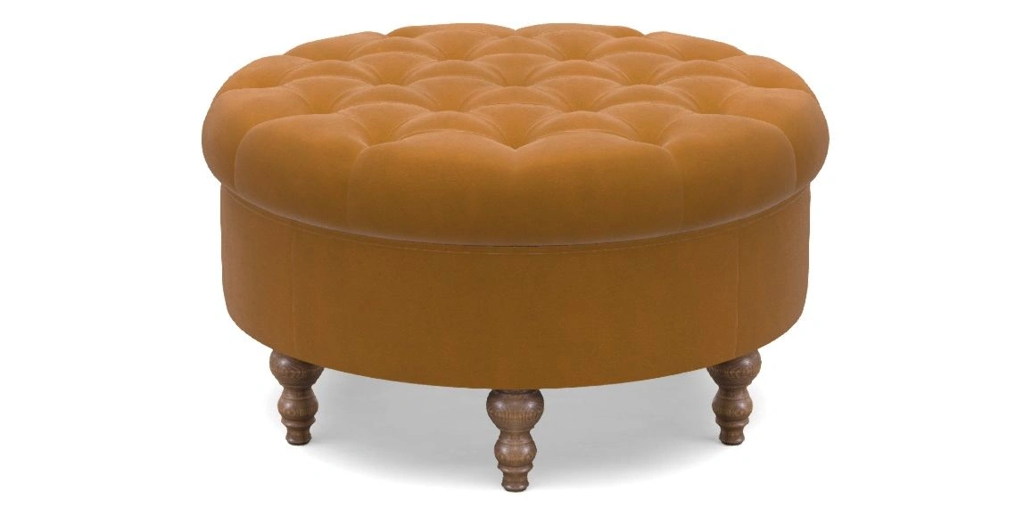A round, deep-buttoned footstool design that provides a comfortable spot for resting feet or serving a tray of tea. A stylish and practical addition to any space.