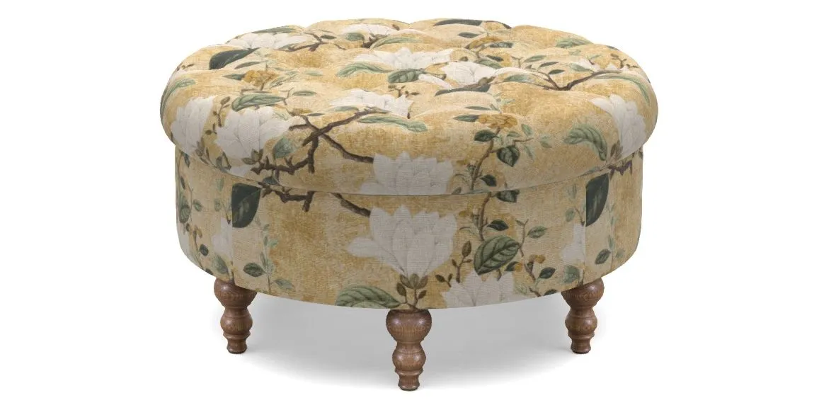 A round, deep-buttoned footstool design that provides a comfortable spot for resting feet or serving a tray of tea. A stylish and practical addition to any space.
