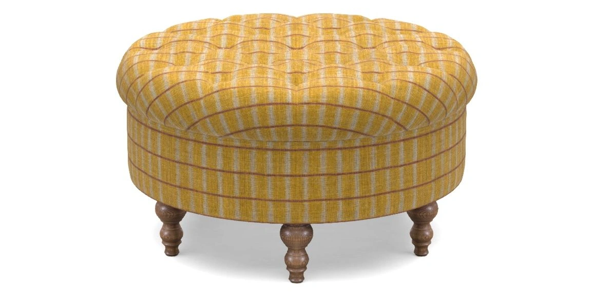 A round, deep-buttoned footstool design that provides a comfortable spot for resting feet or serving a tray of tea. A stylish and practical addition to any space.