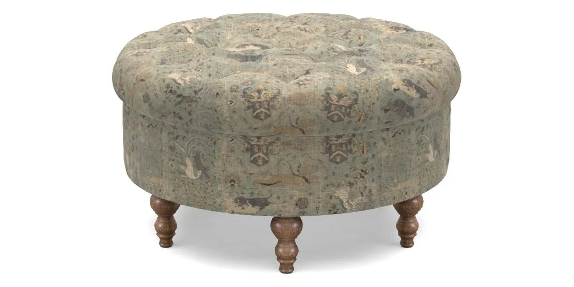 A round, deep-buttoned footstool design that provides a comfortable spot for resting feet or serving a tray of tea. A stylish and practical addition to any space.